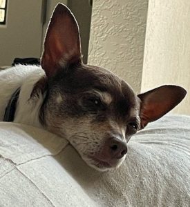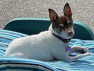 PERMANENT ODH FOSTER HOME NEEDED: Spayed female rat terrier (maybe with chihuahua?), 11#, 14 years old. This little dog has early heart disease and is taking medication; otherwise she’s in quite good shape though there MAY be a funny spot inone xray that still needs to be confirmed. She’s active, would love to go for walks but isn’t thrilled about car rides (has only been going in the car to vet etc. so might learn to enjoy being a car buddy), housebroken, good meeting new people. She’s very happy with lap time.