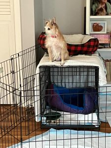 “Daphne is a friendly, affectionate little Chi mix who fits right in with my pack of weirdos. She has charmed everyone, dogs and humans alike. Funny story about the first hour she was home. I placed her in the exercise pen in the family room so she could see and get to know the other dogs. The first time I left I room I found her sitting on top of the crate inside the pen (see picture). The second time l left, I found her running around the family room meeting and greeting all the other dogs. So much for my slow, get acquainted set up! And that’s Daphne! Life is too short to take it slow. This little live wire has jumped in with all four paws. She is just the bright spot we needed in the middle of winter. Welcome Daphne!”