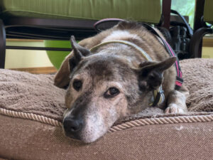 Meanwhile, Juno, estimated to be about 12 years old, is settling in well, carefully trying out each dog bed to pick her favorite. Her sunny disposition is amazing. One only has to speak her name and she jumps up and bounces over to you – somewhat wobbly on her three legs – with her tail wagging wildly. Even though she tires quickly, she is enthusiastic about going out for walks. She especially enjoys meeting new people and dogs. We are working on a couple very short walks a day, hopefully building up her exercise tolerance. Juno’s health issues will probably always be a concern. But thanks to Old Dog Haven, she will always have the best in veterinary care, and a family to love and care for this gentle old girl.