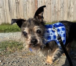 Poe is hard of hearing and his vision isn’t great but that certainly does not stop him from reminding his fosters when it is time for a meal or treat! He loves his walks, his little trot is so cute. Poe takes a daily supplement for his ailing liver and pain medication and glucosamine for arthritis. Poe has a funny howl-like bark (AR-ROOO!!) that makes his fosters smile. His vet says he has “old dog lungs,” which from time to time causes some coughing. Could it be he lived with a smoker at some point in his life?